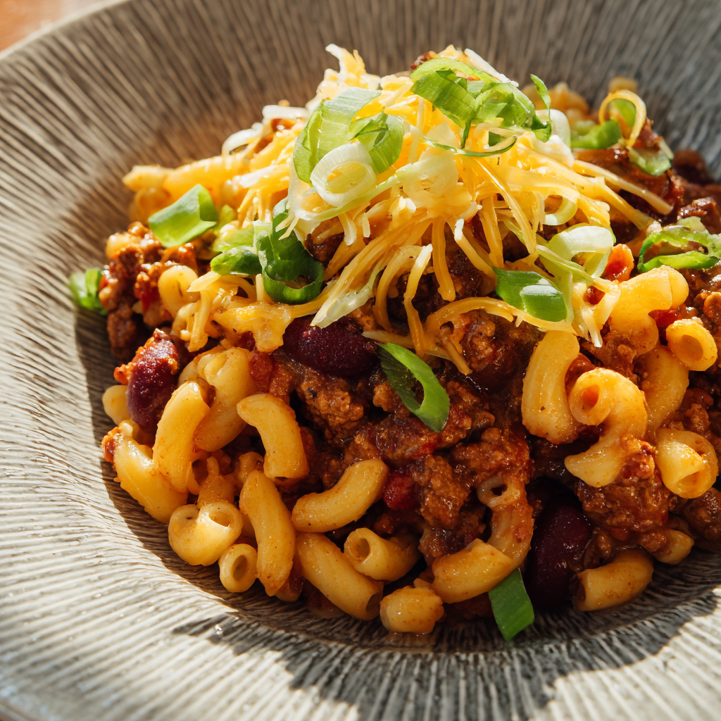 A hearty comfort food favorite that combines rich, flavorful chili with tender macaroni, topped with melted cheese and fresh green onions. Served alongside warm cornbread for the ultimate cozy meal.