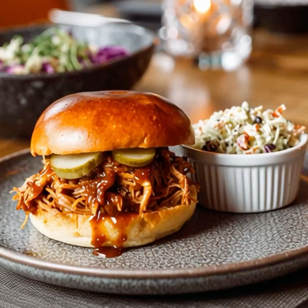 A mouthwatering burger featuring tender, slow-cooked pulled pork slathered in barbecue sauce, topped with crunchy coleslaw, all served on a soft toasted bun. A perfect balance of smoky, sweet, and tangy flavors.