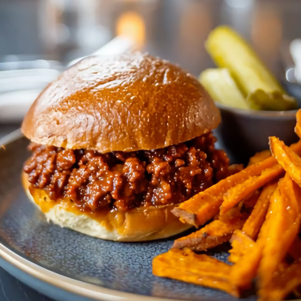 A classic American comfort food featuring savory, saucy ground beef served on a soft bun, paired with crispy and naturally sweet oven-baked sweet potato fries. A fun, family-friendly meal!