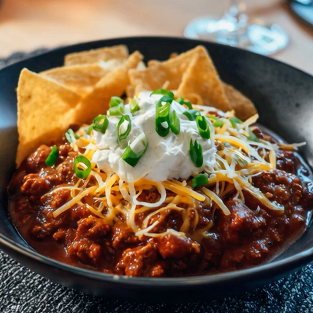 A hearty and flavorful chili made with lean ground turkey, beans, and spices, served hot in a bowl and topped with shredded cheese, sour cream, and chopped onions. Perfectly paired with crunchy tortilla chips for dipping.
